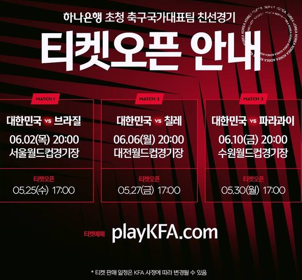 한국 축구대표팀과 브라질의 평가전 티켓이 25일 오후 5시부터 예매를 시작한다.